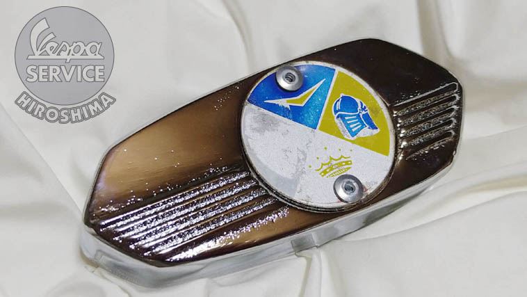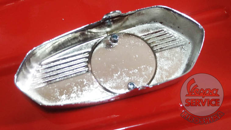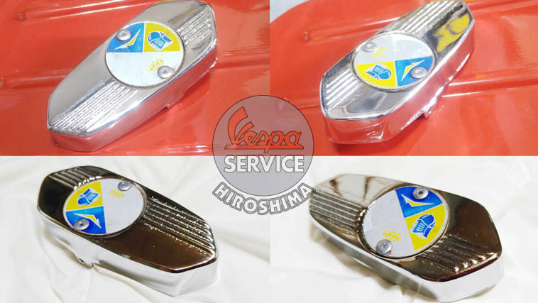 一度丸いロゴエンブレムを外し、下地を整えてから再メッキに出しました。]