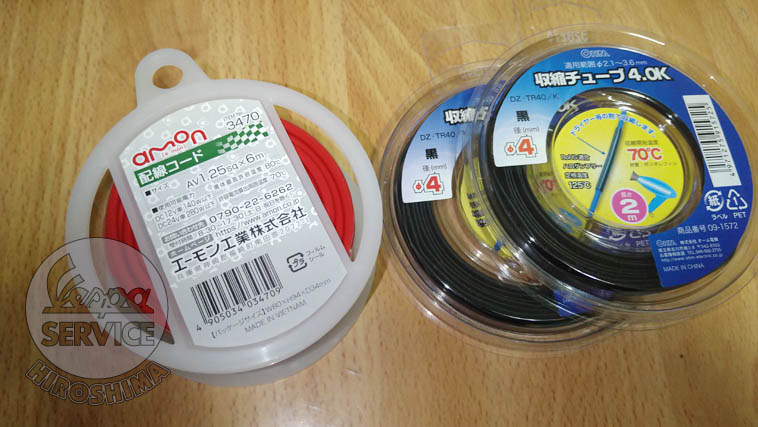 [こちらが朝から11時間待ってようやく午後8時過ぎに届いた配線と収縮チューブです。]