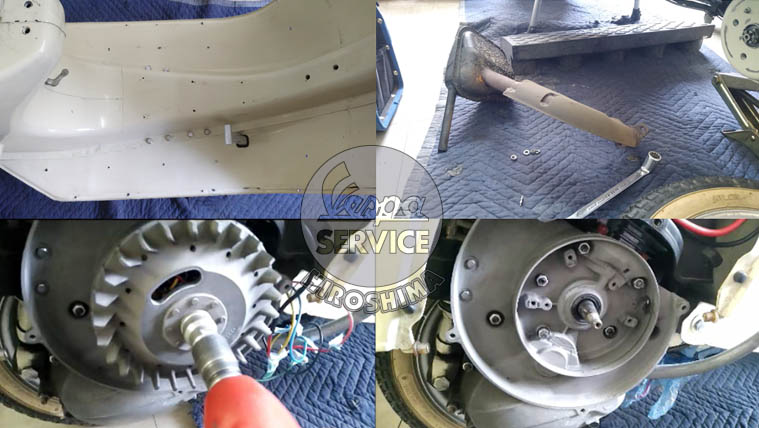 [フロアレール、マフラー、そしてフライホイールとバックプレートを外しました。]