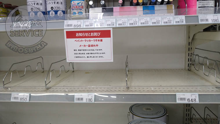[こちらはホームセンターで撮影したモノです。相変わらずシンナーの棚はガラガラでした。